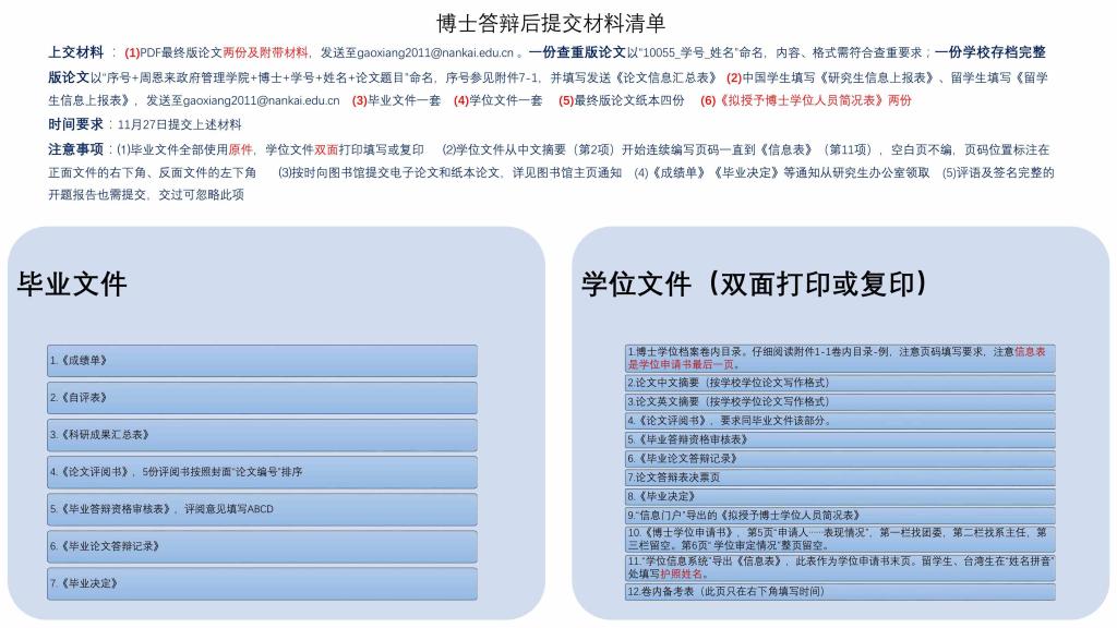 研究生答辩结束后需要及时准备各种毕业及申请学位的材料,学术型硕士生和博士生需要提交的材料清单分别如下: