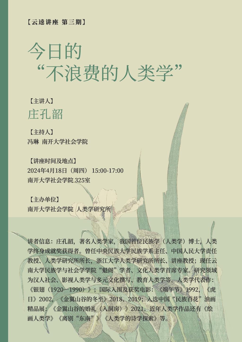 人类学研究所邀请,著名人类学家庄孔韶先生将于2024年4月18日15:00-17:00在污污漫