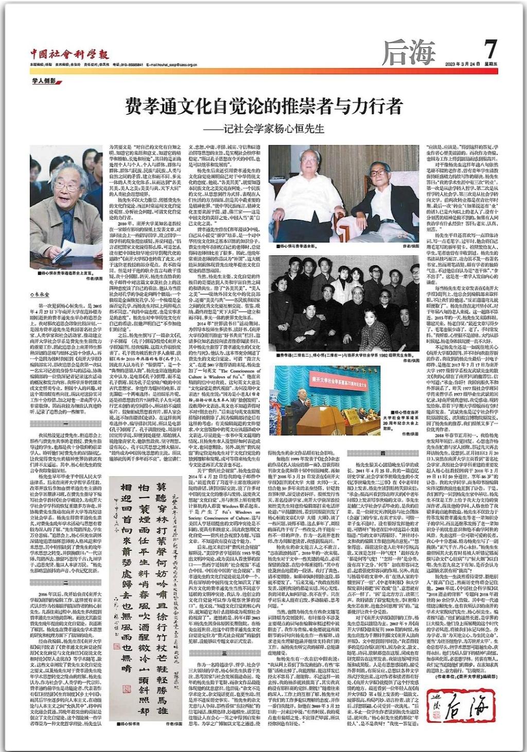 报》副刊的编辑工作,这样便有幸正式认识作为校报副刊资深作者的杨心恒先生。几番往来过程中,杨先生多次提到费孝通先生对他的影响,而他尤其推崇费先生晚年提出的文化自觉论。我逐渐了解到,杨先生在费孝通先生学术思想的研究和梳理方面下了很深的功夫。